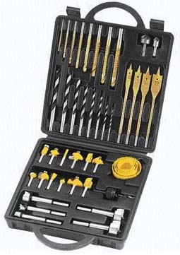 With 8 titanium nitride-coated wood boring drills diameter: 3 to 10mm